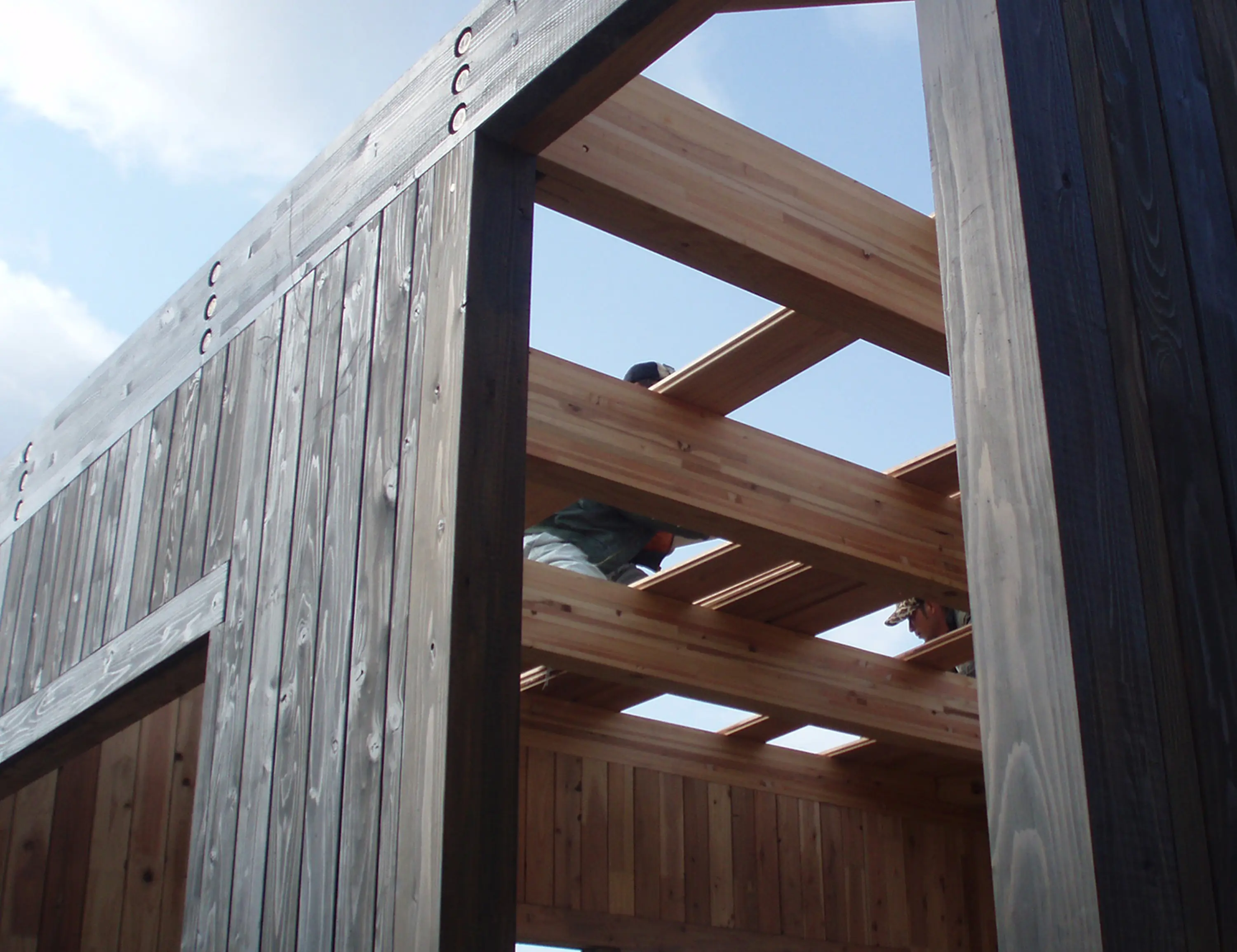 強度の高い杉の集成材を使用しており、尚且つ本来柱として利用するサイズの105角の木材を壁として利用しています。その材の厚さゆえに防火性能にも優れています。2010年に国交省認定の防火試験を受け合格しました。