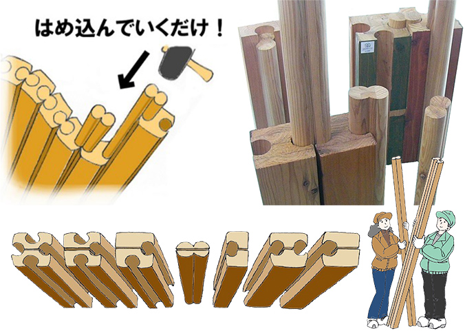 105角の柱(キット)に、接合部(ジョイント)をはめ込んで繋げていくだけで壁が出来上がる、全く新しい建材です。