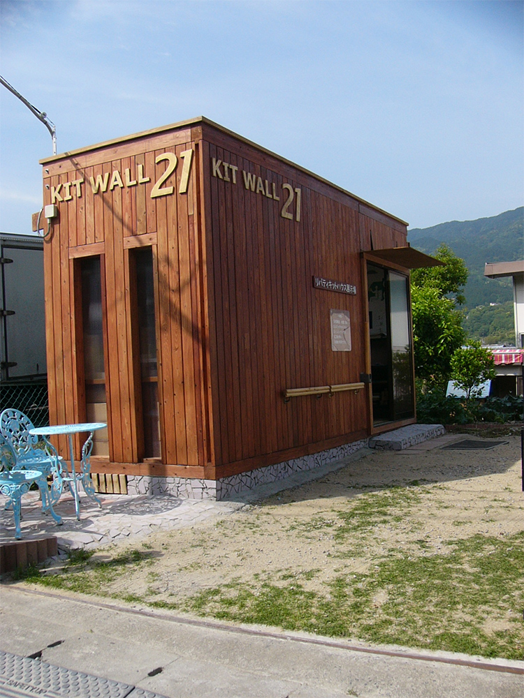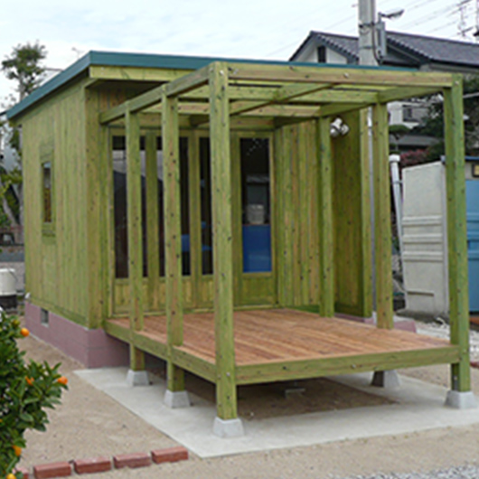 通常のログハウスキットとは違い、柱で壁をつくる工法で、ハンマーひとつで簡単に組み立てができるのが特徴です。当社のログハウスキットは一般の住居としても使える高い耐震性と優れた居住性で、住居用から店舗・イベント・倉庫としても利用されています。