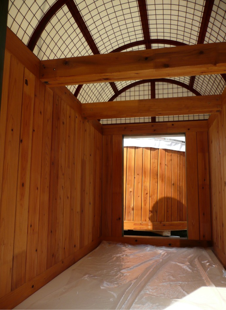 柱の数が、リアリムキットやログハウスに比ベ少ないので、屋根瓦の重さで倒壊する可能性があります。通常は壁材に燃えにくい素材を覆うことになっています。 |